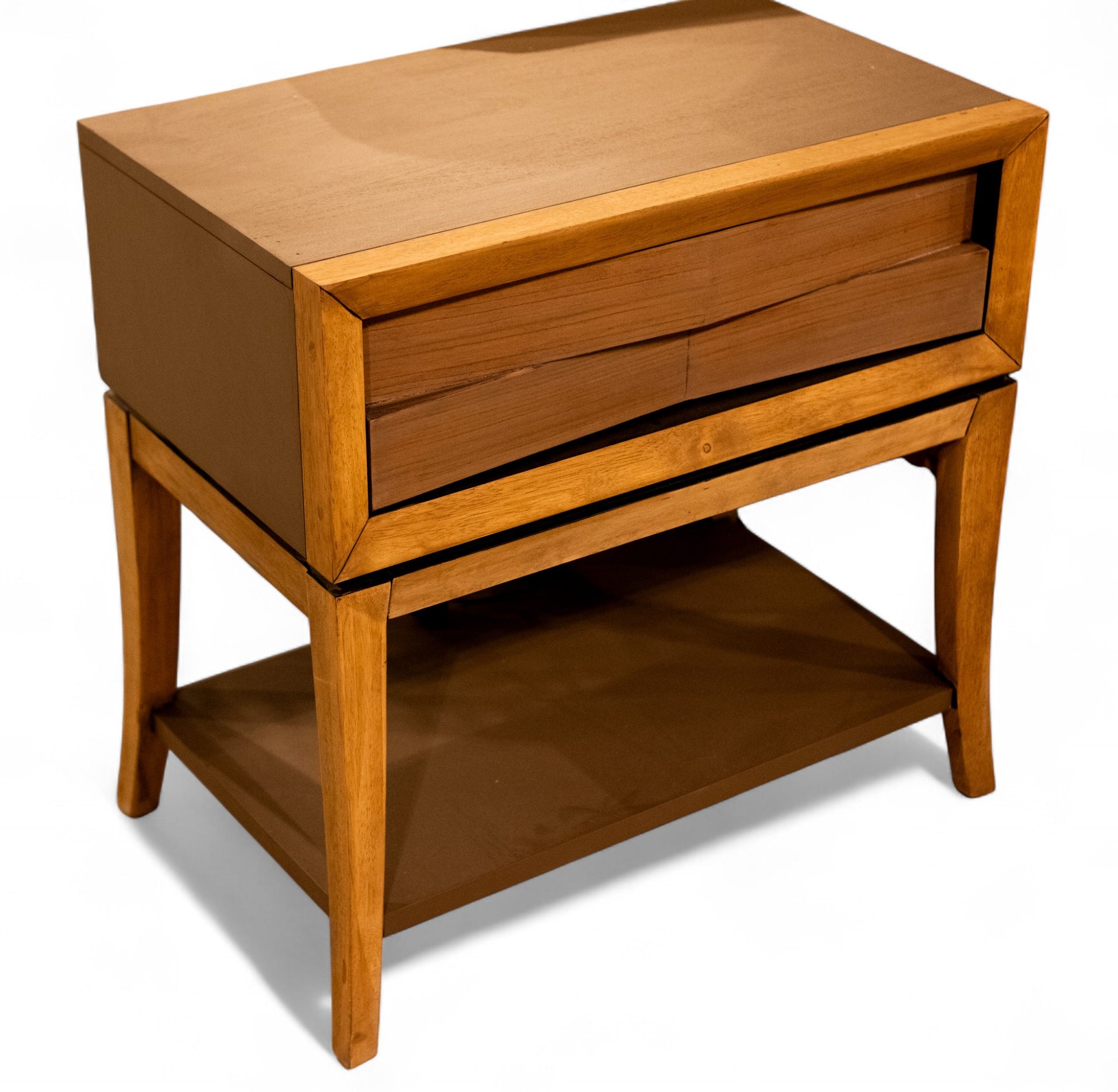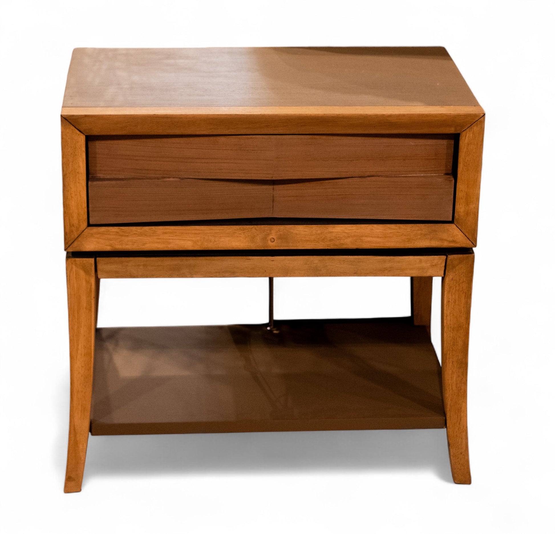 This Mid Century Modern Nightstand is crafted entirely from wood, showcasing timeless design and durable construction. Its clean lines and minimalist form make it a versatile addition to any bedroom, providing both style and practical storage. Expertly built to complement mid-century interiors, this nightstand offers a unique blend of functionality and classic elegance. Recently re-finished with local pickup/delivery only.